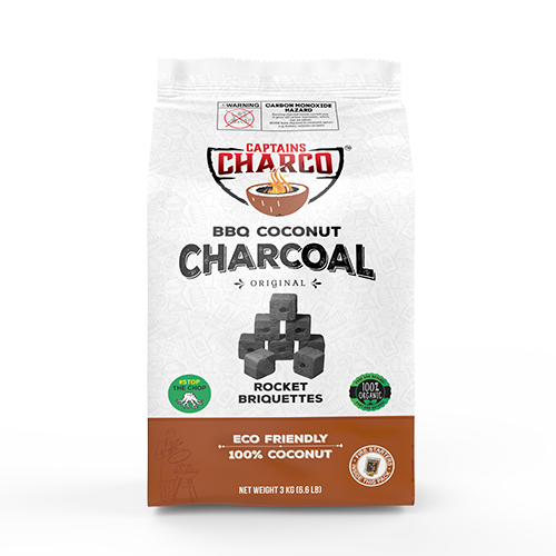 Premium coconut shell charcoal briquettes made chemical free and designed to be quick lighting, offering twice the heat compared to wood.