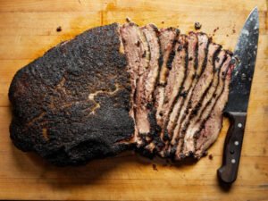 Slice your brisket against the grain. Sounds pretty simple huh? Well, you will find that brisket has the grain going two different directions. This is because this is two different pieces of meat. The simplest way is to remove the point from the flat and slice both in the appropriate direction.